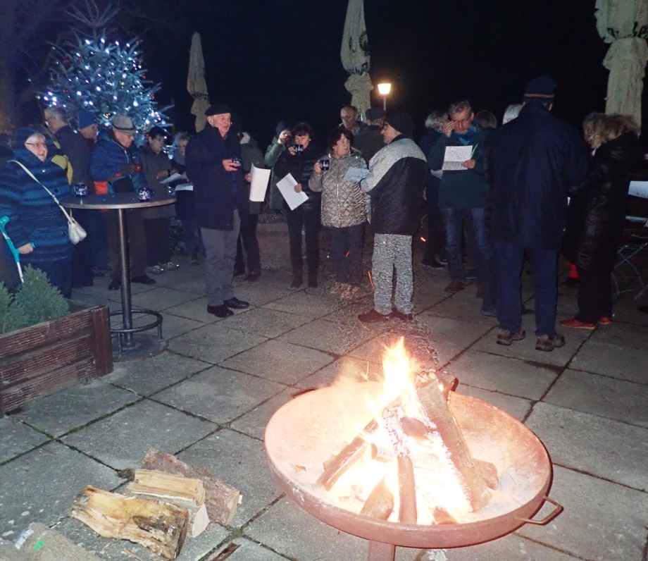 Zur Begrüßung gab es Glühwein auf der Terrasse. Dazu verbreitete das Feuer in der Feuerschale angenehme Wärme, um gemeinsam ein paar Weihnachtslieder zu singen.