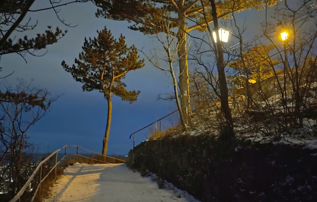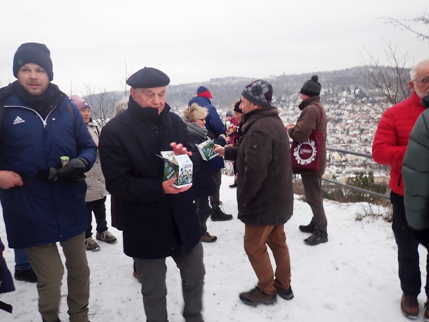 Mit Gesprächen klang ein gemütlicher Abend aus, bevor der Abstieg mit Schneeflocken begleitet in unsere hell erleuchtete Stadt Jena erfolgte.
